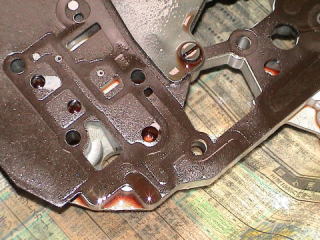 この部分が原因であれば、リバースにシフトしても、ガスケットが油路を塞いでいるのですぐに圧力が上がらず、ガスケットの僅かなひびの間からオイルが通過するのに時間がかかってしまい、リバースクラッチが作用するのに時間が掛かると言う説明がつきます。